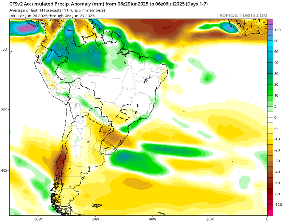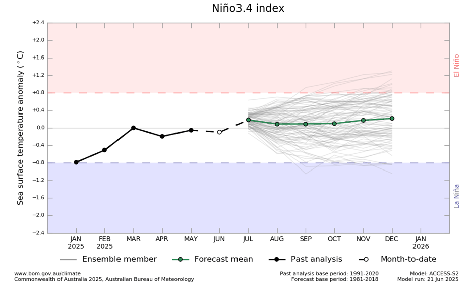 El fenómeno de El Niño-Oscilación del Sur (ENOS) es neutro. El último valor de Niño 3.4 para la semana que finalizó el 8 de junio fue de -0,07 °C. Los valores neutros de ENOS se encuentran entre -0,8 °C y +0,8 °C.