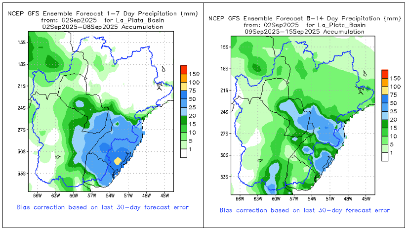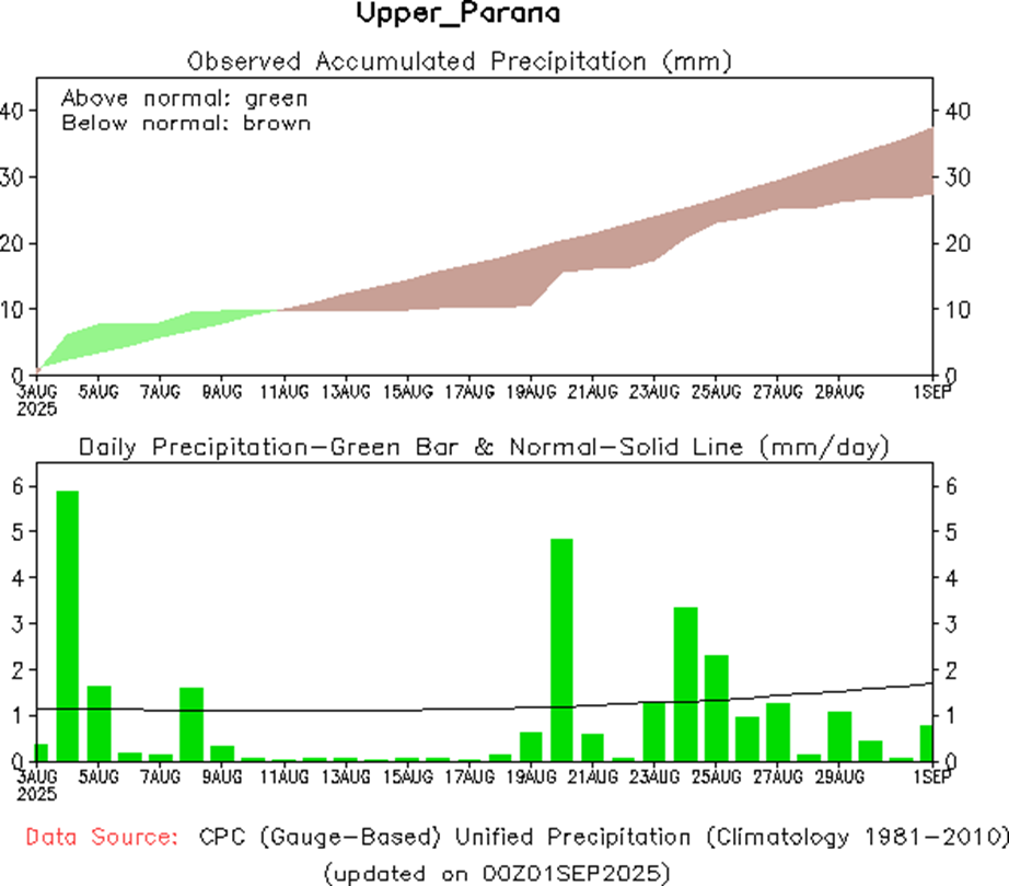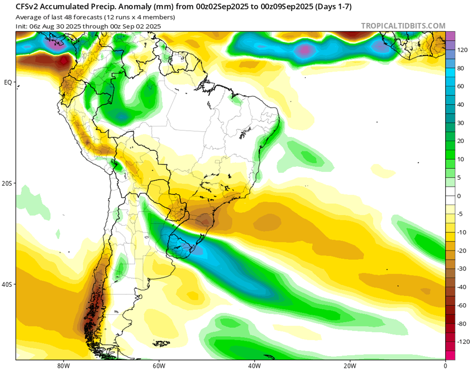 El fenómeno de El Niño-Oscilación del Sur (ENOS) se mantiene neutral. El último valor de Niño3.4 para la semana que finalizó el 24 de agosto es de -0,28 °C. Los valores neutrales de ENOS para Niño3.4 se encuentran entre -0,8 °C y +0,8 °C. Si bien las aguas subsuperficiales del Pacífico tropical han mostrado signos de enfriamiento en las últimas semanas, los indicadores atmosféricos se mantienen mayormente neutrales.
