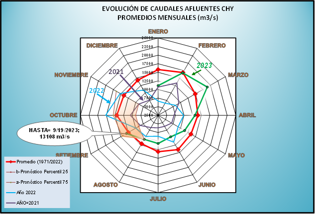 El caudal afluente a la CHY diario, pronosticado para la fecha de hoy es de 13.000 m3/s, y para el día de mañana se espera una afluencia del orden de 13.000 m3/s.