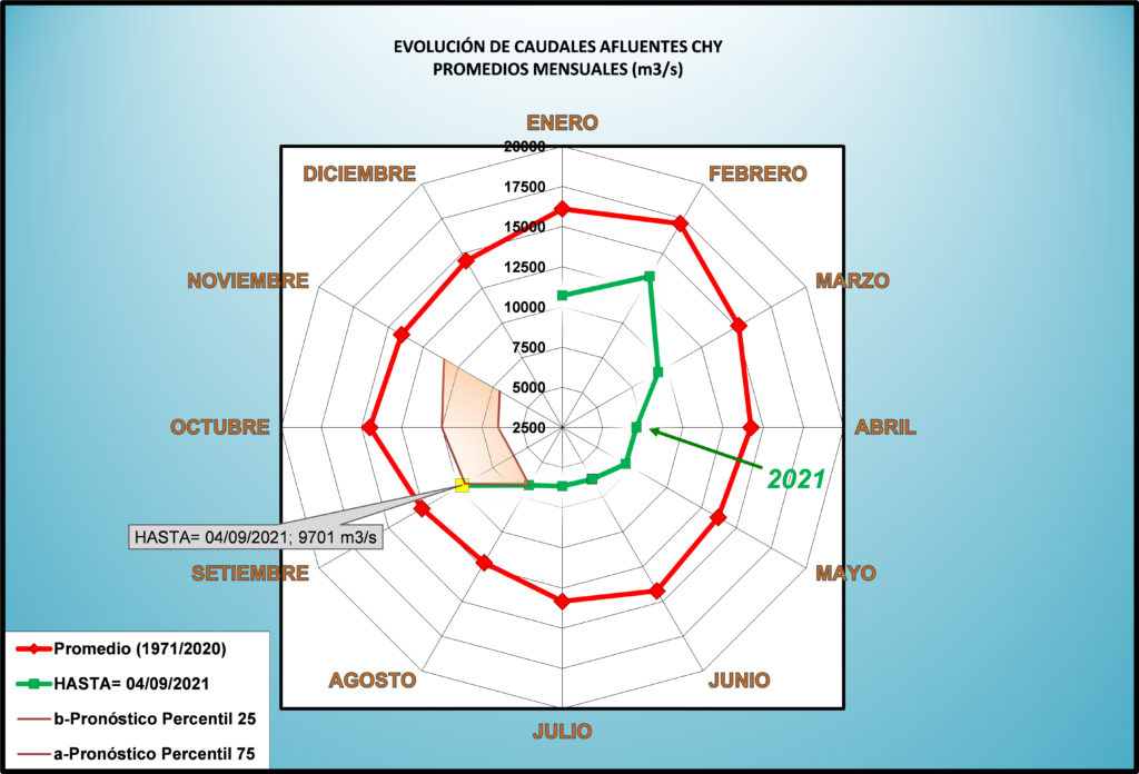 El caudal afluente a la CHY diario, pronosticado para la fecha de hoy es de 9.700 m3/s, y para el día de mañana se espera una afluencia del orden de 8.700 m3/s.