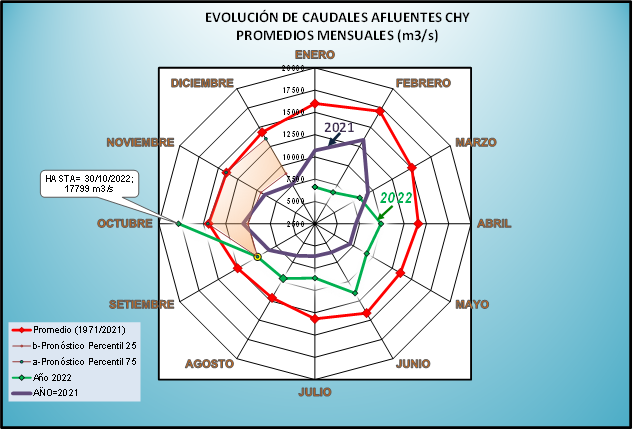 El caudal afluente a la CHY diario, pronosticado para la fecha de hoy es de 15.600 m3/s, y para el día de mañana se espera una afluencia del orden de 17.500 m3/s.