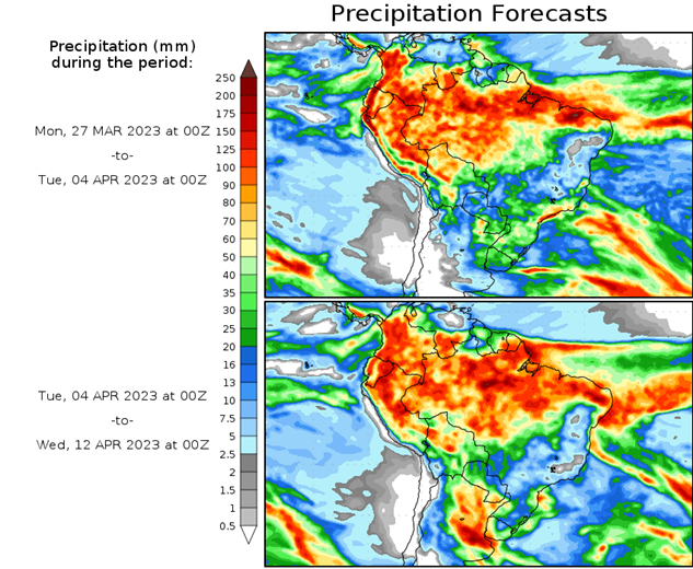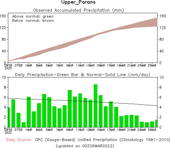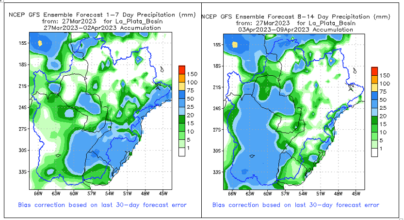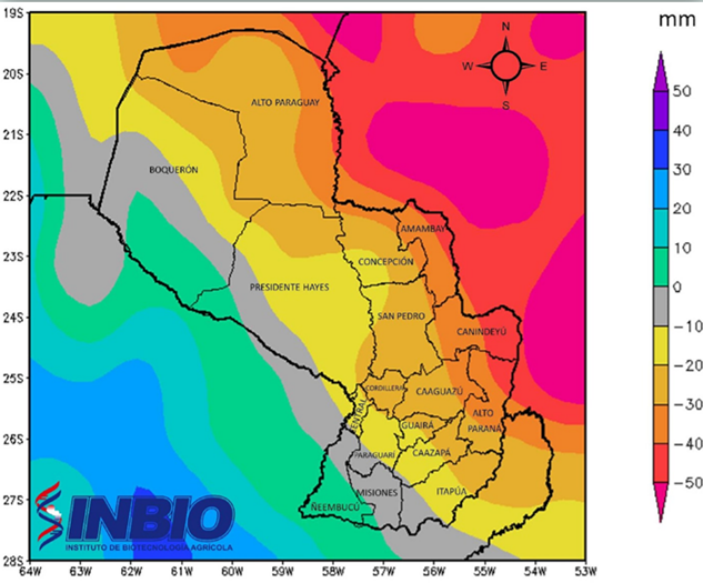 En el mes de abril, se prevé acumulados de precipitaciones en niveles más deficitarios de lo que habitualmente llueve en este periodo, sobre gran parte del territorio nacional, a excepción de algunos sectores hacia el extremo suroeste de la Región Oriental, como también hacia algunas áreas en el extremo oeste de la Región Occidental que observarían volúmenes de lluvias normales.