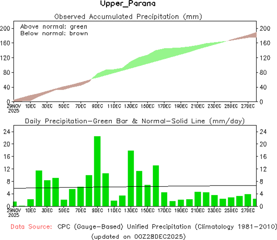 • La Niña está en curso en el Pacífico tropical. Hay indicios de que el océano Pacífico tropical y la atmósfera están acoplados, lo que significa que actualmente actúan para reforzar y mantener el patrón de La Niña. El último valor relativo del índice de temperatura de la superficie del mar (TSM) Niño3.4 para la semana que finalizó el 7 de diciembre de 2025 es de -0,74 °C. Los valores sostenidos por debajo de -0,80 °C son consistentes con un patrón de La Niña. Los valores semanales del índice relativo Niño3.4 han fluctuado alrededor del umbral de La Niña desde mediados hasta finales de septiembre.