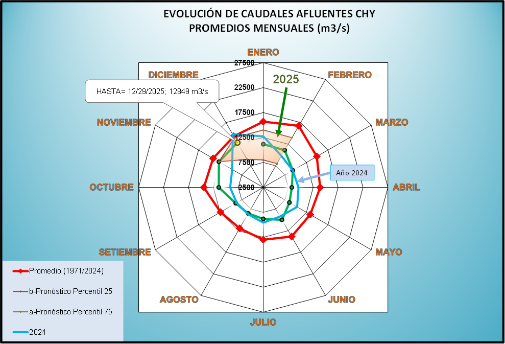El caudal afluente a la CHY diario, pronosticado para la fecha de hoy es de 13.100 m3/s, y para el día de mañana se espera una afluencia del orden de 13.100 m3/s.