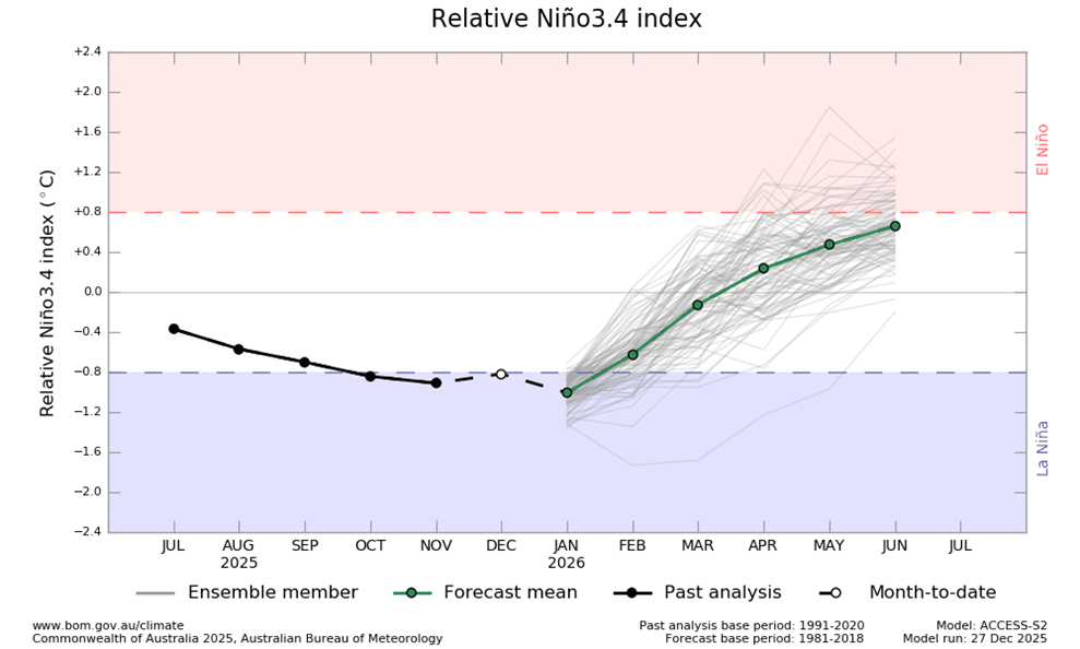 • El modelo actual de la Oficina predice que las temperaturas del Océano Pacífico tropical probablemente permanecerán en los niveles de La Niña hasta principios de 2026 antes de volver a ser neutrales, en gran medida consistente con la mayoría de los modelos internacionales, pero antes de que se desintegren típicamente durante el evento ENSO.