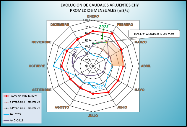 Para el pronóstico hidrológico se considera la programación energética y las previsiones de caudales afluentes (medias diarias) que son realizadas teniendo en cuenta las condiciones actuales y pronósticos disponibles, que además están sujetas a revisión en función de eventuales cambios en las condiciones hidrometeorológicas (además de fenómenos localizados como el viento que se traduce en oleaje) y de las descargas de las Centrales Hidroeléctricas aguas arriba de la CHY.