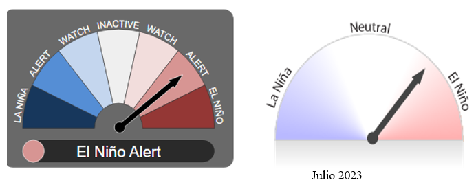 La Perspectiva ENSO está en Alerta El Niño. Cuando los criterios de Alerta de El Niño se han cumplido en el pasado, un evento de El Niño se ha desarrollado alrededor del 70% del tiempo.