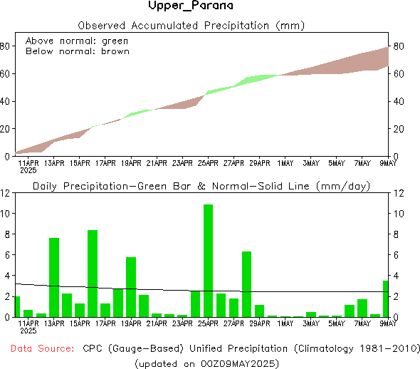 Para el trimestre considerado, se prevén valores inferiores a la normal en gran parte de la región oriental, mientras que en el resto del territorio nacional, se esperan condiciones normales.