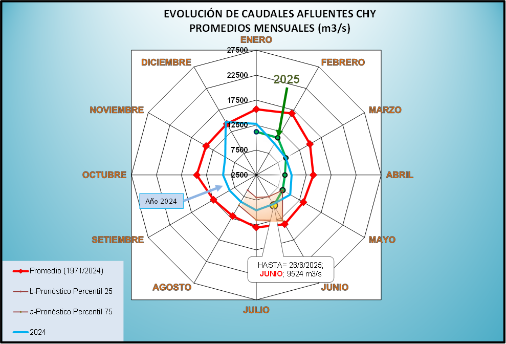 El caudal afluente a la CHY diario, pronosticado para la fecha de hoy es de 10.600 m3/s, y para el día de mañana se espera una afluencia del orden de 12.500 m3/s.