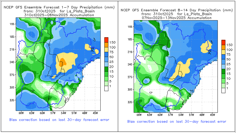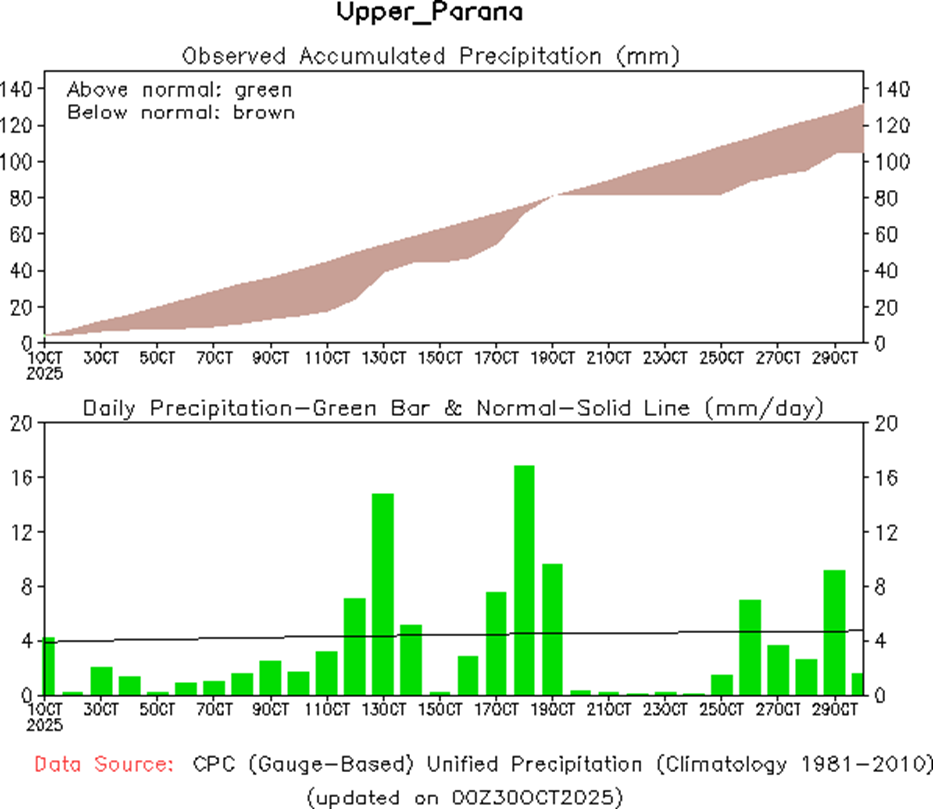El Niño-Oscilación del Sur (ENOS) se mantiene neutral. El último valor relativo del índice de TSM de Niño3.4 para la semana que finalizó el 12 de octubre de 2025 fue de -0,79 °C. En las dos semanas anteriores, el índice de Niño3.4 cayó por debajo de -0,8 °C. Los valores entre -0,8 °C y +0,8 °C se consideran neutrales respecto al ENOS, mientras que los valores sostenidos por debajo de -0,8 °C (durante al menos tres meses) se consideran indicativos de La Niña.