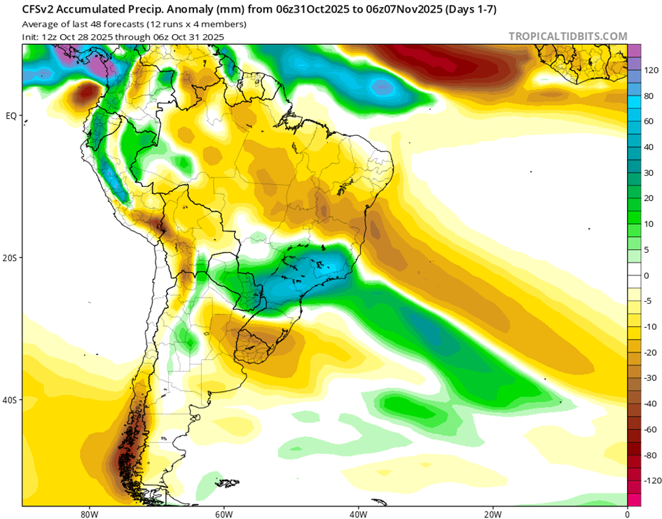 El índice del Modo Anular Sur (SAM) se encuentra en valores neutrales al 11 de octubre. Se prevé que caiga brevemente a valores negativos la próxima semana antes de volver a valores neutrales.