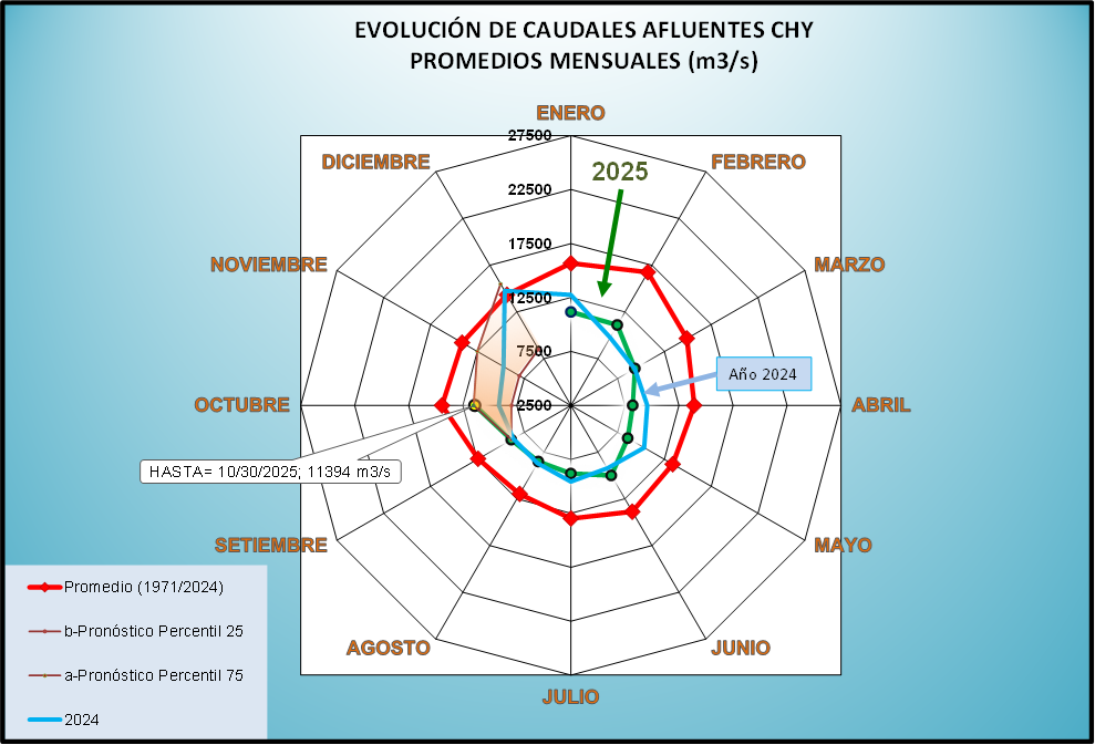 El caudal afluente a la CHY diario, pronosticado para la fecha de hoy es de 12.000 m3/s, y para el día de mañana se espera una afluencia del orden de 12.400 m3/s.