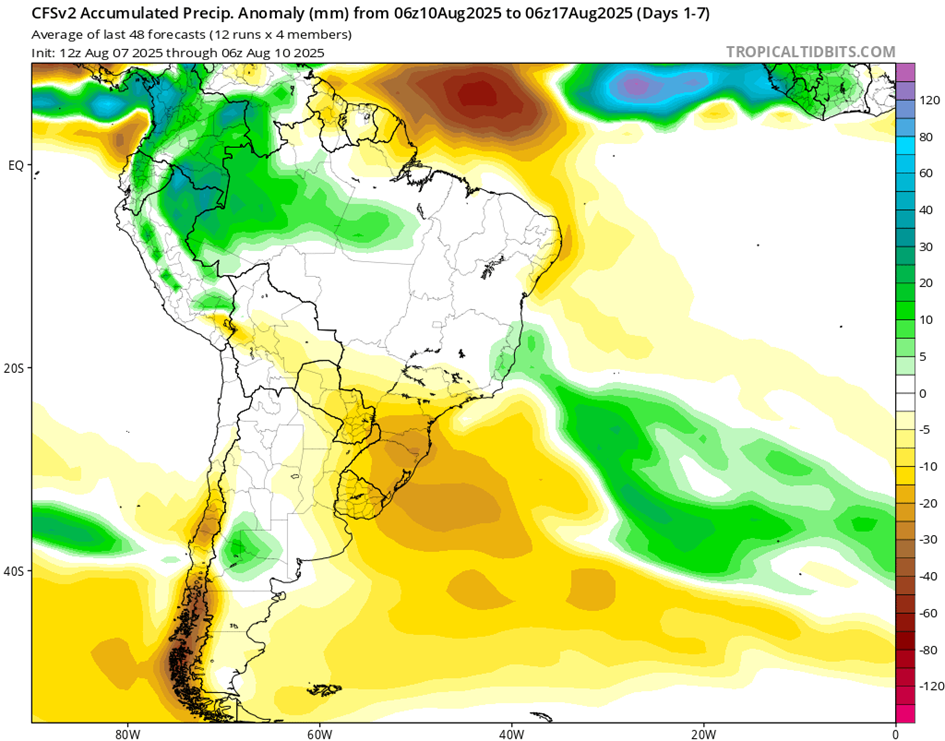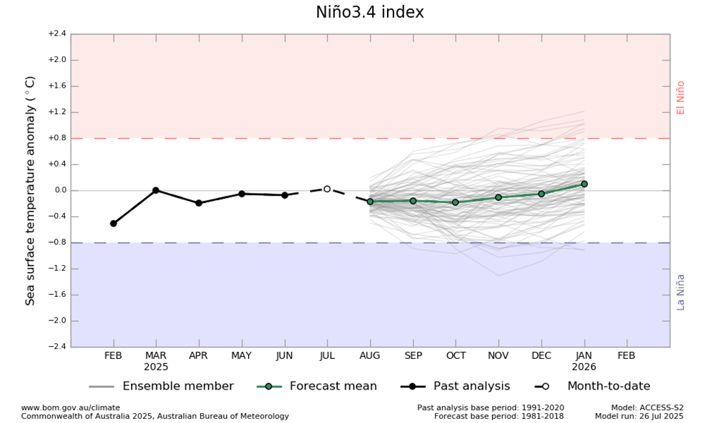 El fenómeno de El Niño-Oscilación del Sur (ENOS) es neutro. El último valor de Niño 3.4 para la semana que finalizó el 8 de junio fue de -0,07 °C. Los valores neutros de ENOS se encuentran entre -0,8 °C y +0,8 °C.