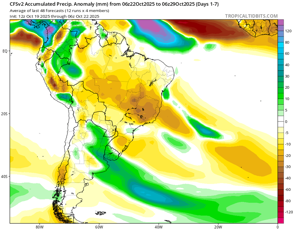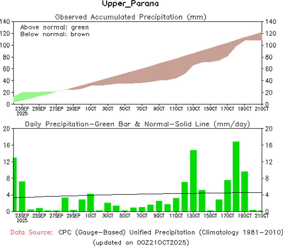 El fenómeno de El Niño-Oscilación del Sur (ENOS) se mantiene neutral. El último valor relativo del índice de temperatura superficial del mar (TSM) Niño3.4 para la semana que finalizó el 28 de septiembre de 2025 es de -0,80 °C. Los valores entre -0,8 °C y +0,8 °C se consideran neutrales respecto al ENOS, mientras que los valores sostenidos por debajo de -0,8 °C (durante al menos tres meses) se consideran indicativos de La Niña.