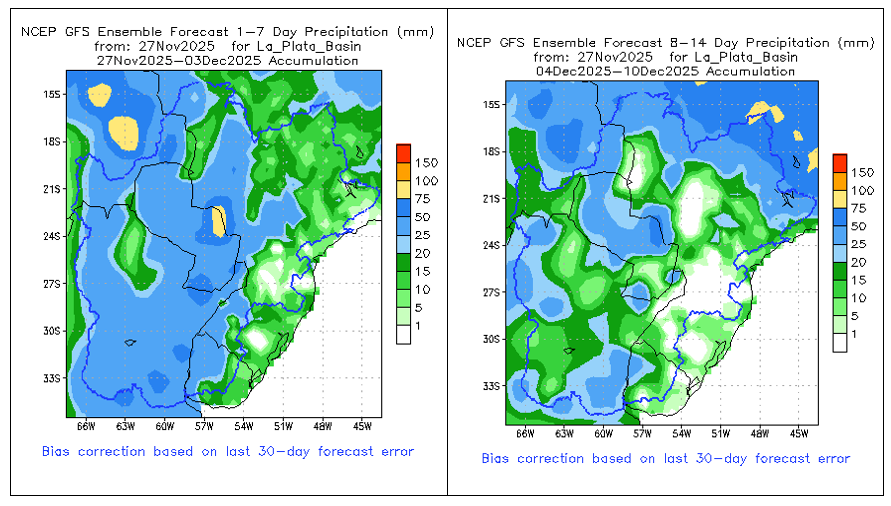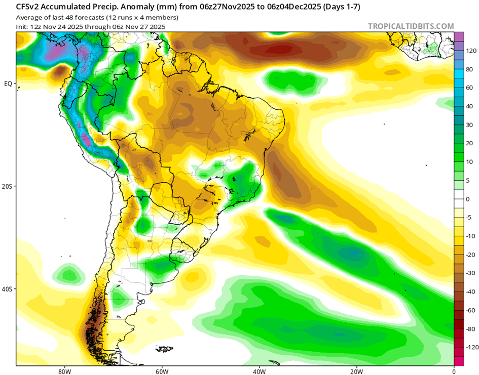 El índice del Modo Anular del Sur (SAM) es negativo al 25 de octubre. Se prevé que aumente en los próximos días hasta alcanzar niveles neutrales y que se mantenga así durante al menos las próximas dos semanas.