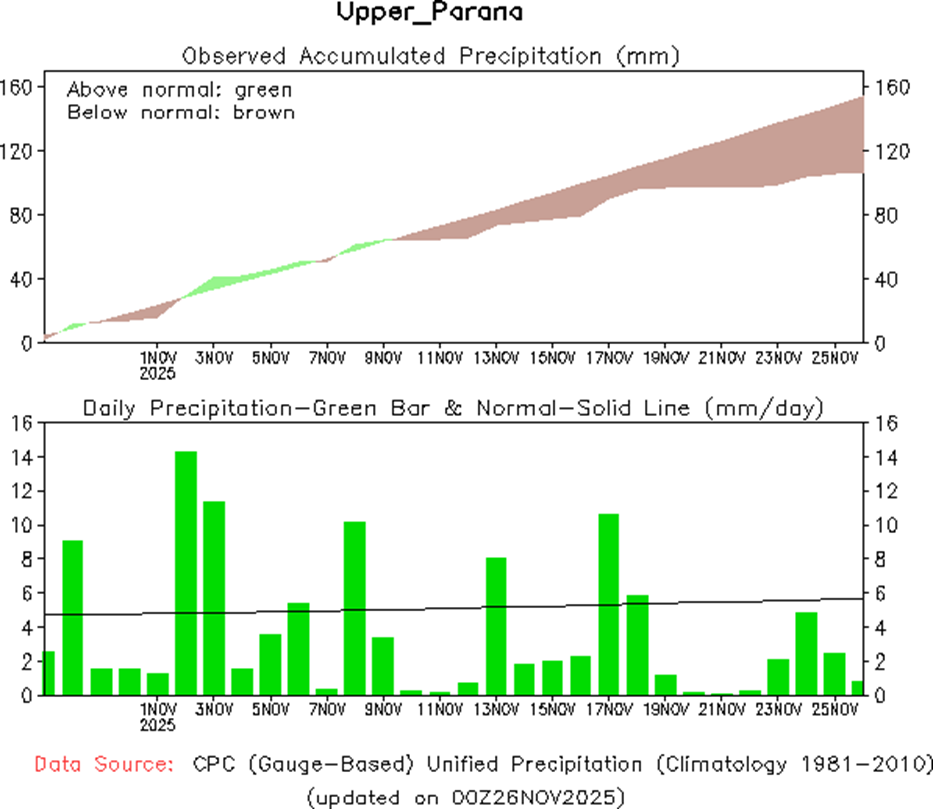 El fenómeno de El Niño-Oscilación del Sur (ENSO) se mantiene neutral, pero hay indicios de que podría estar desarrollándose La Niña. El último valor relativo del índice Niño3.4 de temperatura superficial del mar (TSM) para la semana que finaliza el 9 de noviembre de 2025 es de −0,84 °C. Valores sostenidos por debajo de −0,8 °C son consistentes con un patrón de La Niña. Los valores semanales del índice Niño3.4 relativo han fluctuado en torno al umbral de La Niña desde mediados o finales de septiembre.