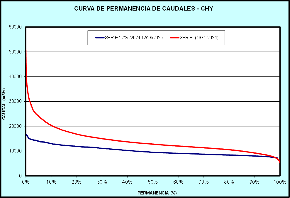 El caudal afluente a la CHY diario, pronosticado para la fecha de hoy es de 12.200 m3/s, y para el día de mañana se espera una afluencia del orden de 11.600 m3/s.