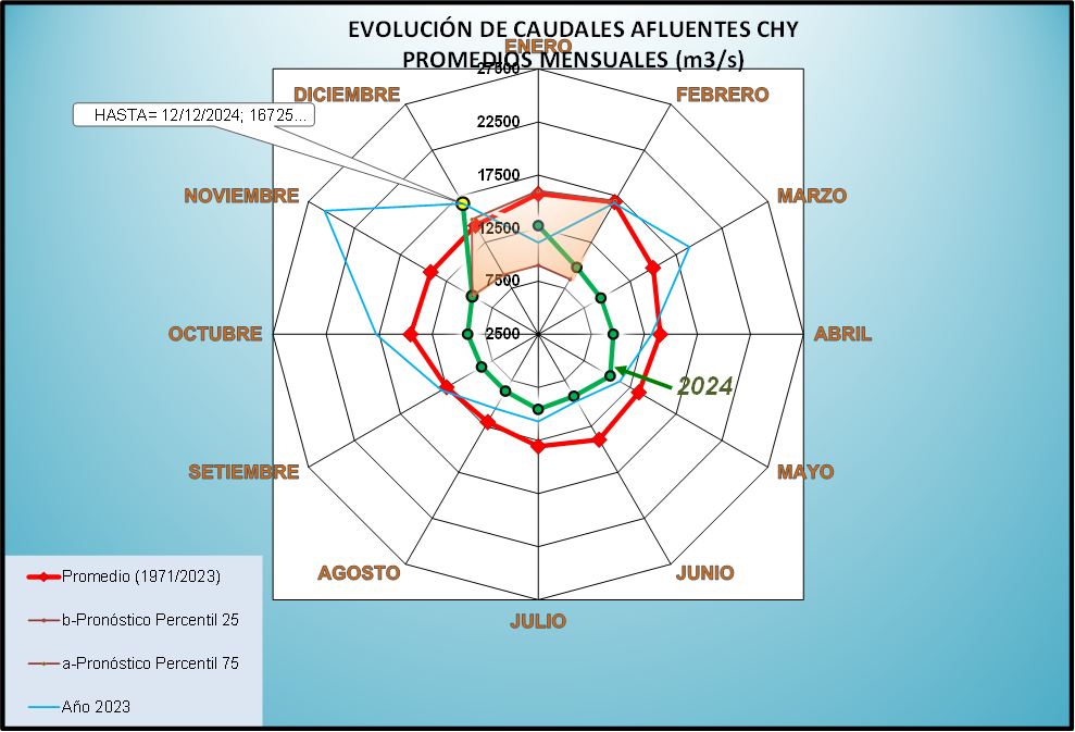 El caudal afluente a la CHY diario, pronosticado para la fecha de hoy es de 20.400 m3/s, y para el día de mañana se espera una afluencia del orden de 18.700 m3/s.