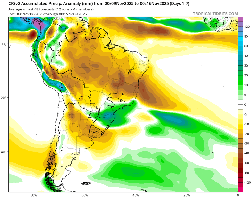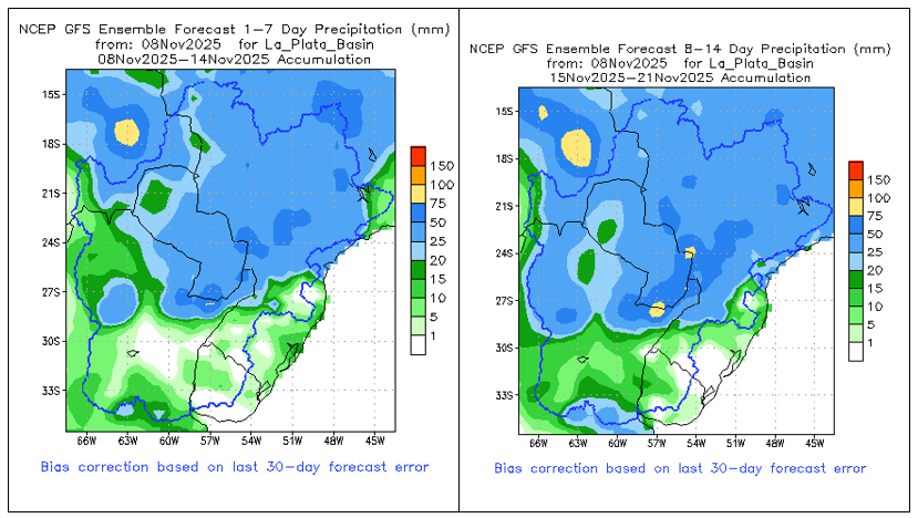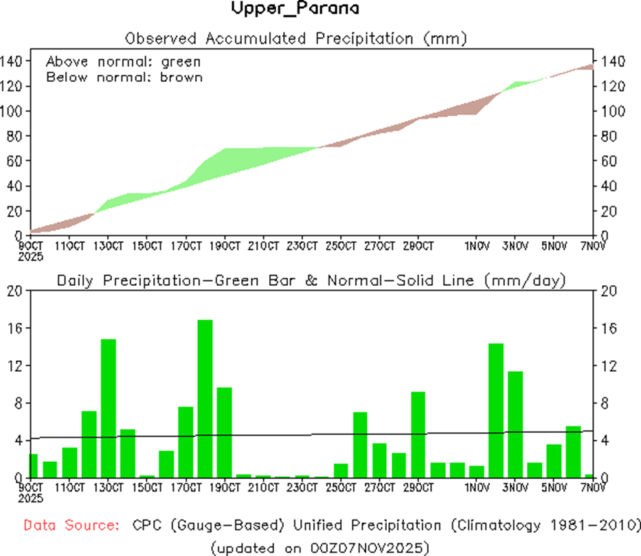 El índice del Modo Anular del Sur (SAM) es negativo al 25 de octubre. Se prevé que aumente en los próximos días hasta alcanzar niveles neutrales y que se mantenga así durante al menos las próximas dos semanas.