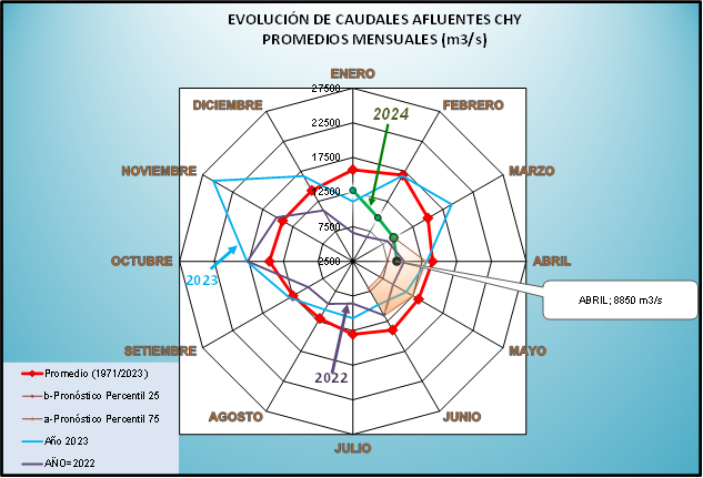 Para el pronóstico hidrológico se considera la programación energética y las previsiones de caudales afluentes (medias diarias) que son realizadas teniendo en cuenta las condiciones actuales y pronósticos disponibles, que además están sujetas a revisión en función de eventuales cambios en las condiciones hidrometeorológicas (además de fenómenos localizados como el viento que se traduce en oleaje) y de las descargas de las Centrales Hidroeléctricas aguas arriba de la CHY.