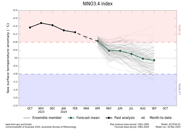 El Niño continúa y está cerca de su fin. Los modelos climáticos indican que se espera que las temperaturas de la superficie del mar en el Pacífico tropical central vuelvan a ser neutras en ENSO más adelante.