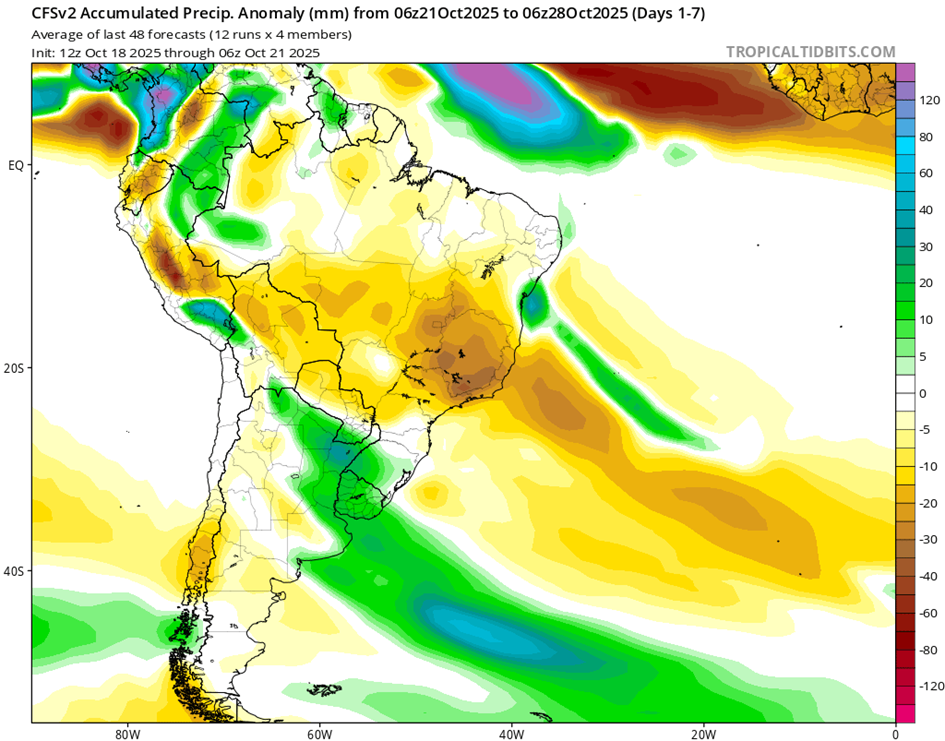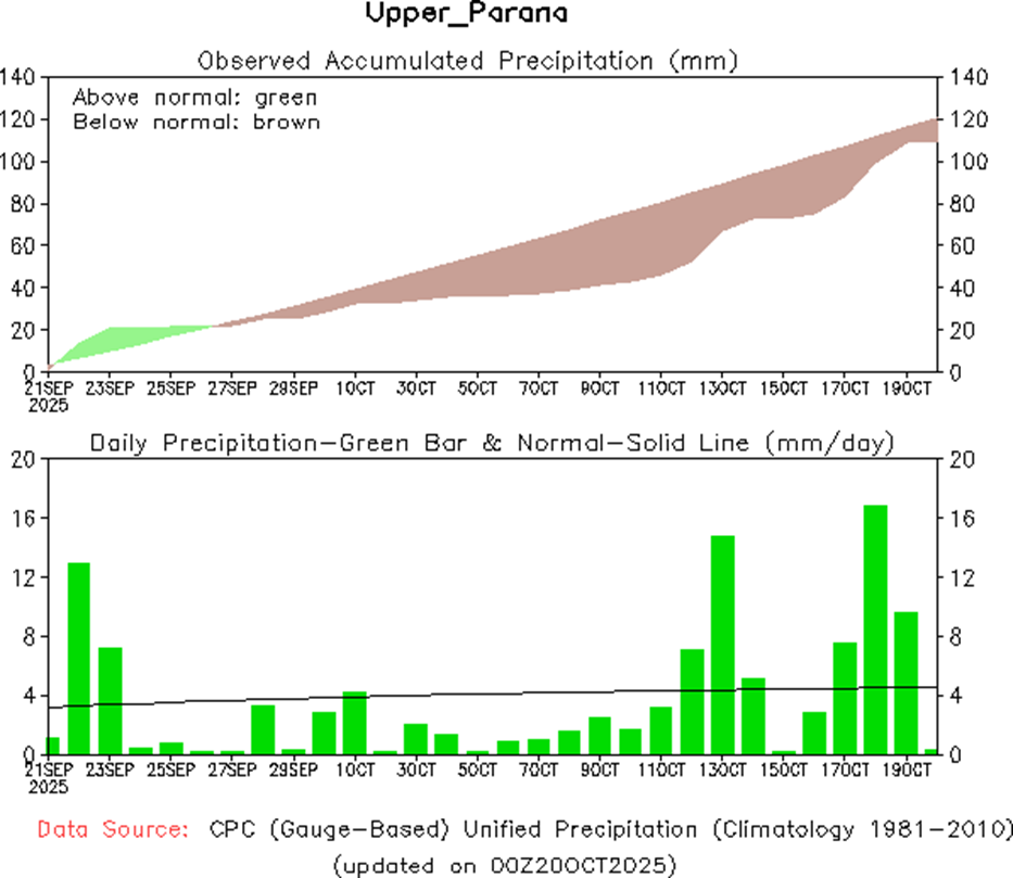 El fenómeno de El Niño-Oscilación del Sur (ENOS) se mantiene neutral. El último valor relativo del índice de temperatura superficial del mar (TSM) Niño3.4 para la semana que finalizó el 28 de septiembre de 2025 es de -0,80 °C. Los valores entre -0,8 °C y +0,8 °C se consideran neutrales respecto al ENOS, mientras que los valores sostenidos por debajo de -0,8 °C (durante al menos tres meses) se consideran indicativos de La Niña.