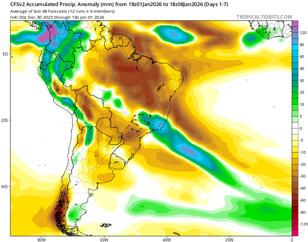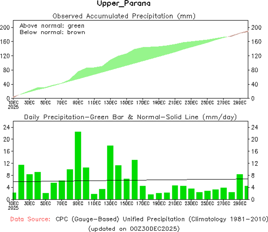 • El índice del Modo Anular Sur (SAM) se mantiene neutral al 20 de diciembre de 2025. Se prevé que se mantenga neutral durante la próxima semana. Posteriormente, se observa una ligera tendencia hacia valores negativos durante las dos semanas siguientes. Sin embargo, existen diversos resultados posibles, lo que implica una menor claridad en la fase del SAM más allá de la próxima semana.
