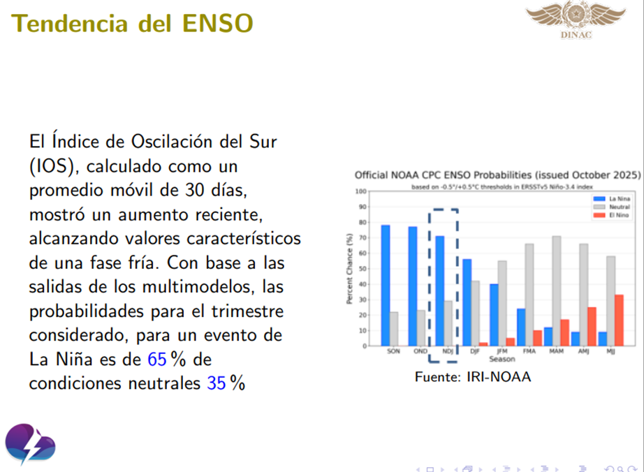 • La Niña continúa en el Pacífico tropical. El último valor relativo del índice de TSM Niño3.4 para la semana que finaliza el 21 de diciembre de 2025 es de -0,91 °C. Los valores sostenidos por debajo de -0,80 °C son consistentes con un patrón de La Niña. Los valores semanales del índice relativo Niño3.4 han fluctuado alrededor del umbral de La Niña desde mediados hasta finales de septiembre.