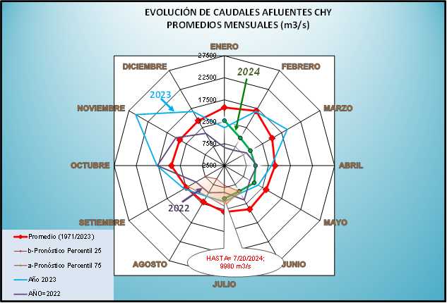 El caudal afluente a la CHY diario, pronosticado para la fecha de hoy es de 9.800 m3/s, y para el día de mañana se espera una afluencia del orden de 9.300 m3/s.