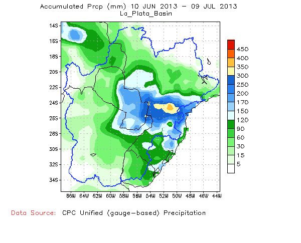 Observación: La crecida originada por los 300 mm de lluvias intensas en la cuenca del río Iguazú (en territorio brasileño) y aguas arriba de los Saltos del Guairá y parte de los Departamentos de Canindeyú y Alto Paraná, entre el 20 y 24 de junio, que transitó por los municipios ribereños aguas abajo de Yacyretá (departamentos de Misiones y Ñeembucú) hacia la confluencia con el río Paraguay, que según los registros estadísticos es la sexta creciente anual más grande desde el año 1901 y sus efectos son muy similares a las de 1997 y 1998 por los caudales picos alcanzados, estando en la actualidad en un proceso recesivo.