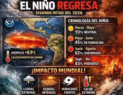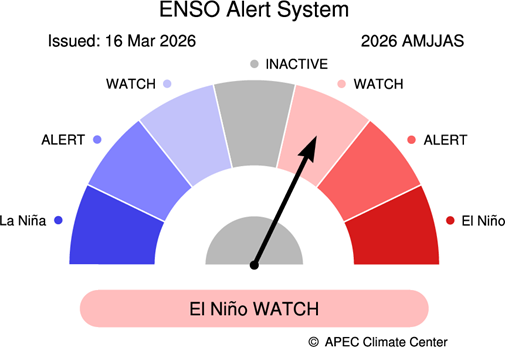 • El fenómeno de La Niña de 2025-2026 está llegando a su fin. Las temperaturas de la superficie del mar en el Pacífico tropical central han superado el umbral de La Niña (−0,80 °C) durante las últimas cuatro semanas, registrándose el último valor relativo del índice Niño3.4 para la semana que finalizó el 15 de marzo de 2026 en -0,53 °C. El calentamiento en las capas subsuperficiales sugiere que es probable que el fenómeno continúe disminuyendo en las próximas semanas.