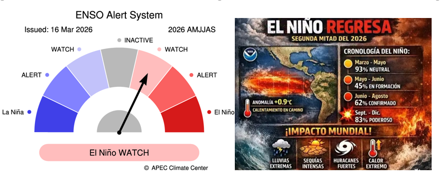 • El fenómeno de La Niña de 2025-2026 está llegando a su fin. Las temperaturas de la superficie del mar en el Pacífico tropical central han superado el umbral de La Niña (−0,80 °C) durante las últimas cuatro semanas, registrándose el último valor relativo del índice Niño3.4 para la semana que finalizó el 15 de marzo de 2026 en -0,53 °C. El calentamiento en las capas subsuperficiales sugiere que es probable que el fenómeno continúe disminuyendo en las próximas semanas.