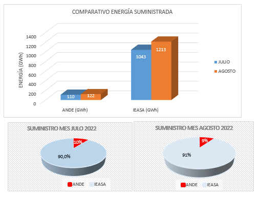 Correspondió a la Administración Nacional de Electricidad (ANDE) 121.946,1 MWh y a Integración Energética Argentina Sociedad Anónima (IEASA) 1.212.822,3 MWh.