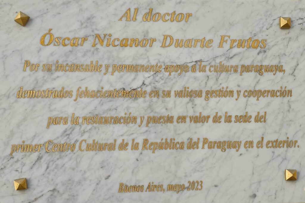La misma reza: “Al doctor Oscar Nicanor Duarte Frutos, por su incansable y permanente apoyo a la cultura paraguaya demostrados fehacientemente en su valiosa gestión y cooperación para la restauración y puesta en valor de la sede del primer Centro Cultural de la República del Paraguay en el exterior”.