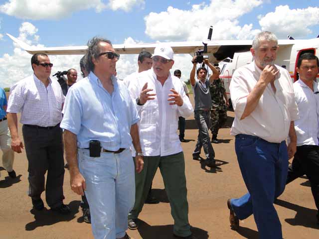 Foto: El presidente Fernando Lugo y los directores Miguel Rodríguez y Oscar Thomas, a su llegada en el aeropuerto de Encarnación.