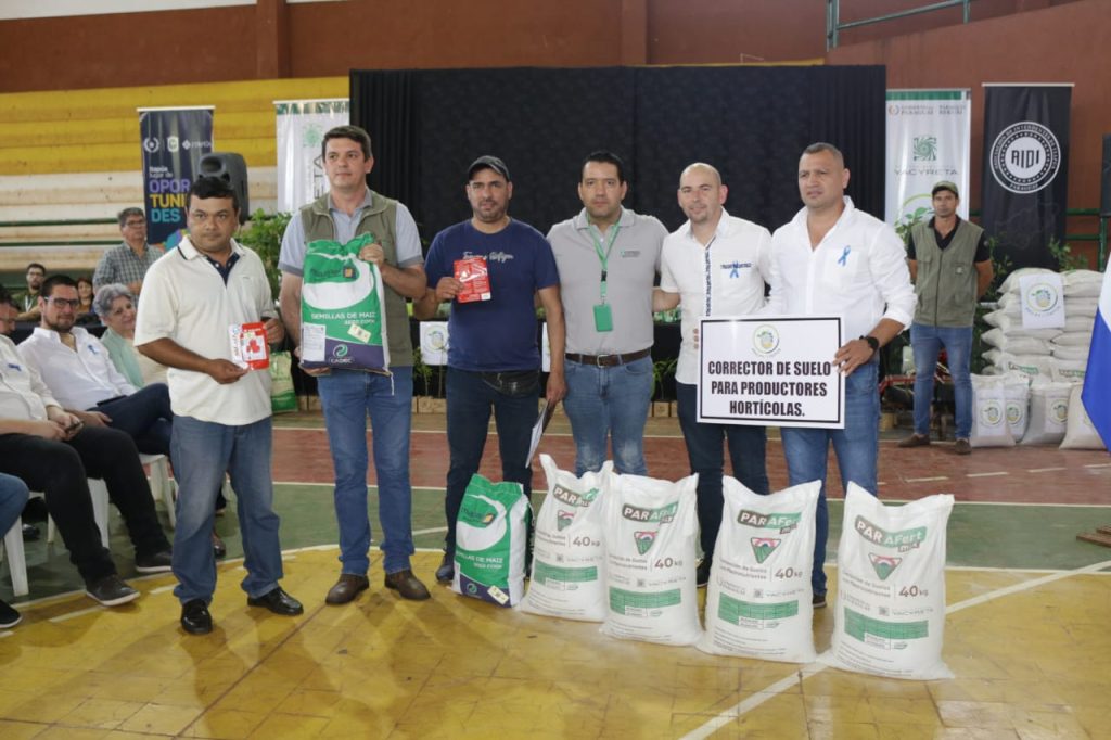 Durante el acto, realizado en el Polideportivo Municipal de Cambyretá, también se distribuyeron insumos para el fortalecimiento del sector agropecuario de los diferentes distritos de la región, incluyendo semillas, productos para la preparación del suelo y el mejoramiento de la producción, el autoconsumo y la renta para la agricultura familiar, en el marco del Programa ProParaguay-Itapúa, que cuenta con un financiamiento de G. 16.000.000.000 por parte de Yacyretá.