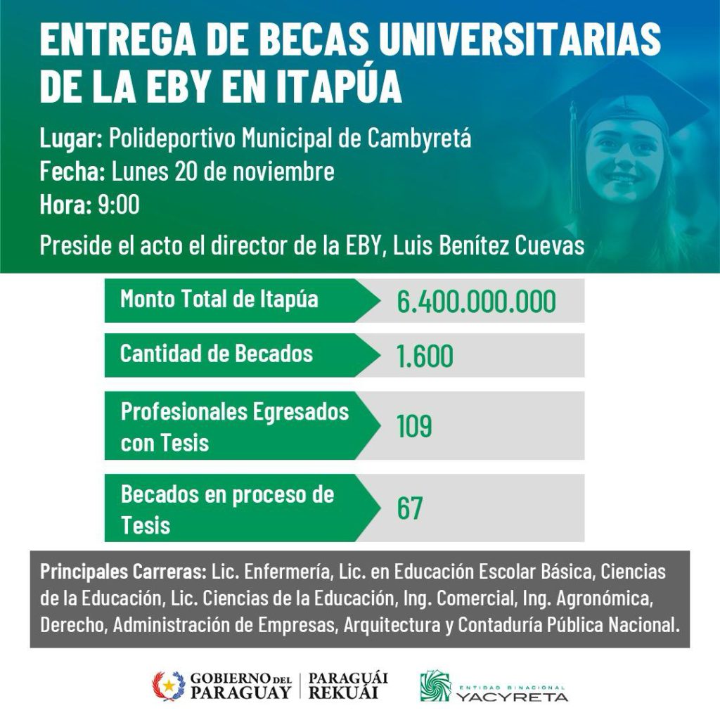 El Gobierno Nacional, a través de la Entidad Binacional Yacyretá (EBY), realizará el segundo pago por becas universitarias en Itapúa. Con un desembolso de G.3.200 millones, completará una inversión de G. 6.400 millones en el año en dicho departamento, beneficiando a 1.600 estudiantes.