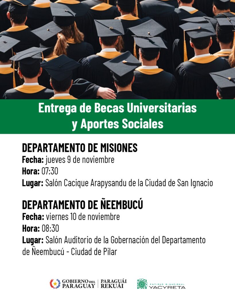 El Gobierno Nacional, a través de la Entidad Binacional Yacyretá (EBY), entregará becas y aportes sociales en Misiones, mañana jueves 9. El acto, que está previsto para las 7:30, en el salón Cacique Arapysandu de San Ignacio, estará presidido por el director de Yacyretá, Lic. Luis Benítez Cuevas.