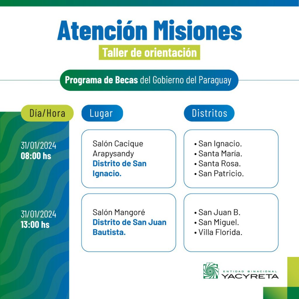 Por su parte, el miércoles 31, en el Salón Cacique Arapysandú de San Ignacio, se llevará a cabo la capacitación para jóvenes de esa ciudad, de Santa María, Santa Rosa y San Patricio, a partir de las 08.00; mientras que a las 13.00, en el Salón Mangoré de la Municipalidad de San Juan Bautista, se atenderá a los estudiantes de la capital de Misiones, San Miguel y Villa Florida.
