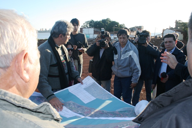 Posteriormente, la comitiva se trasladó a un sitio emblemático: la Zona Baja, otrora corazón comercial de Encarnación. El lugar es hoy una extensa explanada cubierta con arena roja, que se convertirá luego en una zona parquizada.