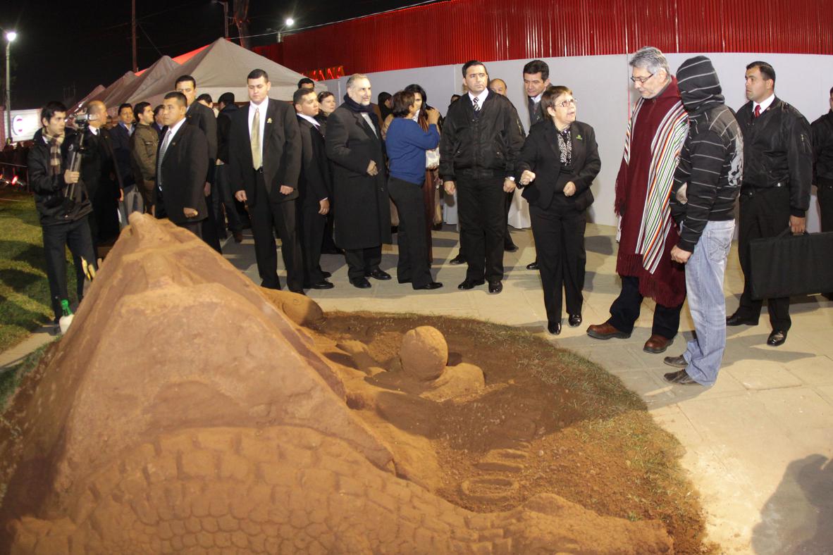 FOTO: El presidente Fernando Lugo conversa con el escultor Oscar Garcete durante la inauguración oficial del stand de la EBY.