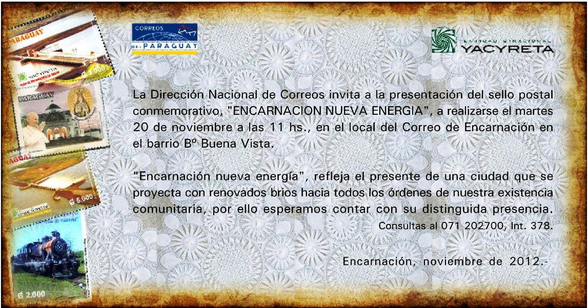 altLa Dirección Nacional de Correos en conjunto con la Entidad Binacional Yacyretá (EBY), presentará oficialmente el sello postal conmemorativo “Encarnación nueva energía”, este martes 20 de noviembre, a las 11 horas en el local de la institución, ubicado en el barrio Ciudad Nueva.