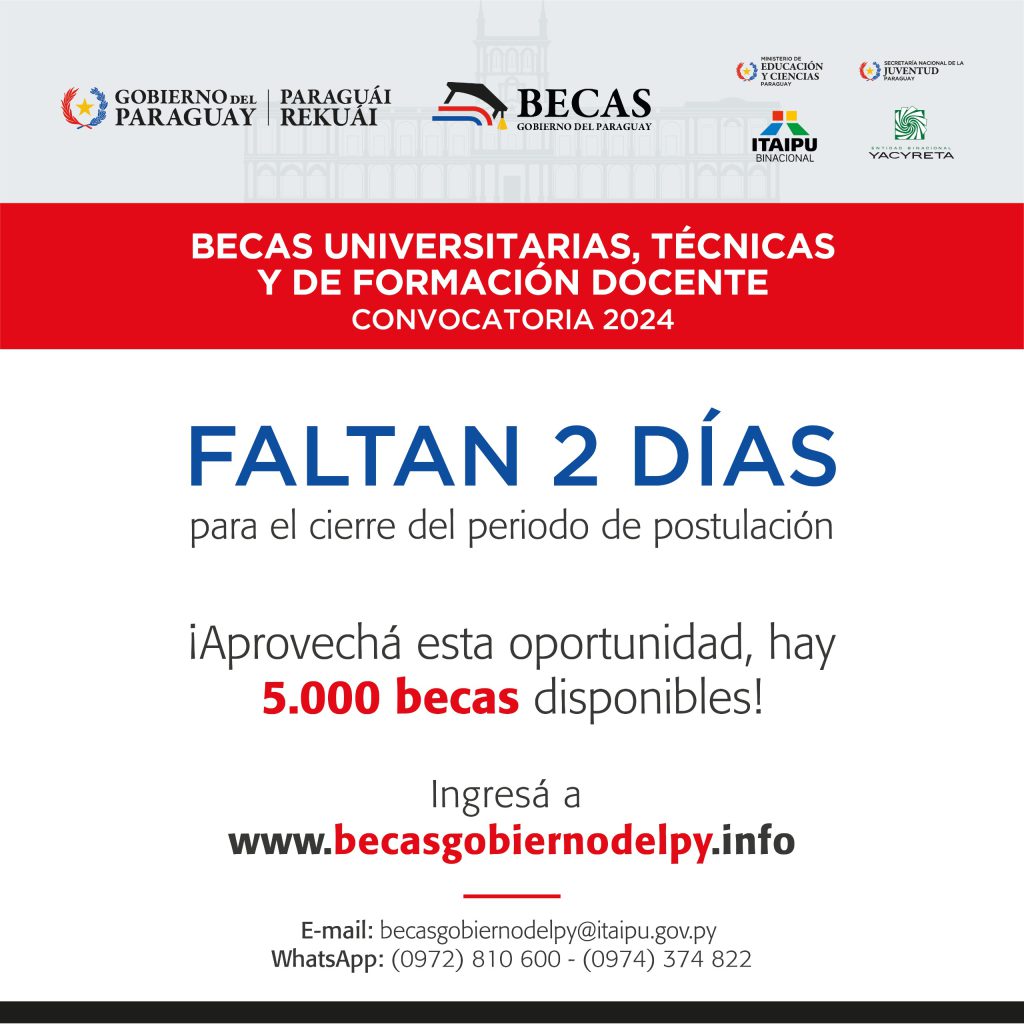 El Gobierno del Paraguay exhorta a los jóvenes a aprovechar la oportunidad para obtener una beca de estudio. Por primera vez en la historia de la educación paraguaya se unificó la oferta académica en una sola ventanilla para el otorgamiento de un total de 5.000 becas para carreras universitarias, técnicas y de formación docente.