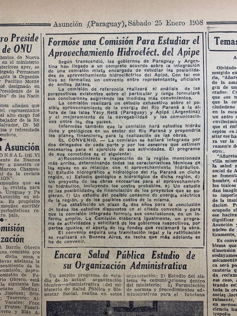 Cabe recordar que la firma del acuerdo se concretó luego de un proceso histórico que tuvo uno de sus fundamentos en el convenio del 23 de enero de 1958, por el cual se creó la Comisión Mixta Técnica Paraguayo-Argentina del Apipé, la cual había encomendado la elaboración de sendos estudios técnicos, económicos y financieros sobre la factibilidad de construir una represa en el río Paraná, así como su eventual emplazamiento.