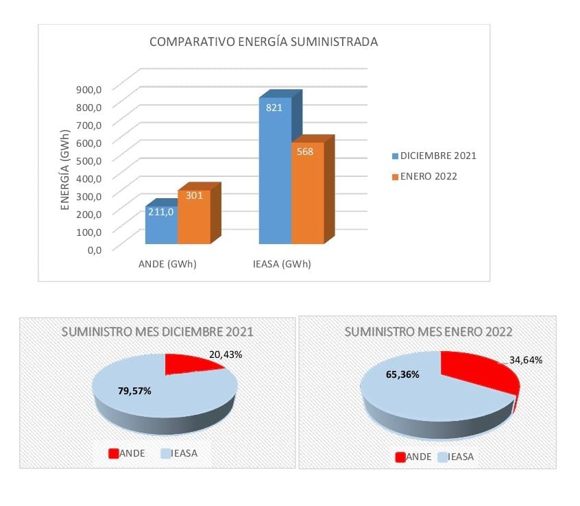 Del total generado correspondió a la Administración Nacional de Electricidad (ANDE) 301.284,6 MWh y a Integración Energética Argentina Sociedad Anónima (IEASA) 568.481,7 MWh.