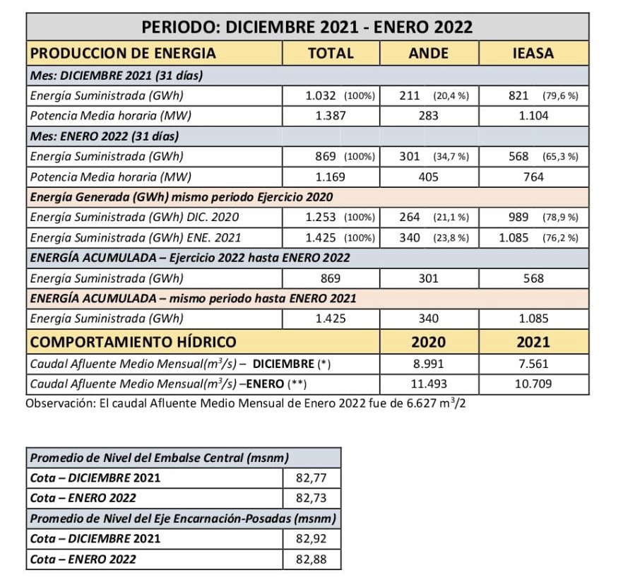 El informe elaborado por el Departamento Técnico de la EBY revela que esto representa 15,73 % menos que el mes de diciembre de 2021, que fue de 1.032.122,8 MWh.
