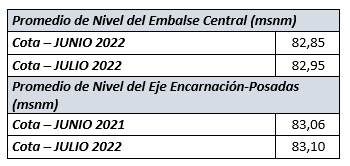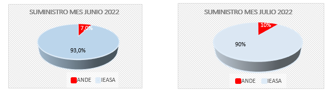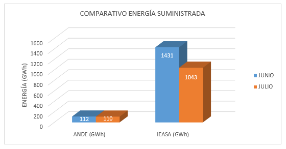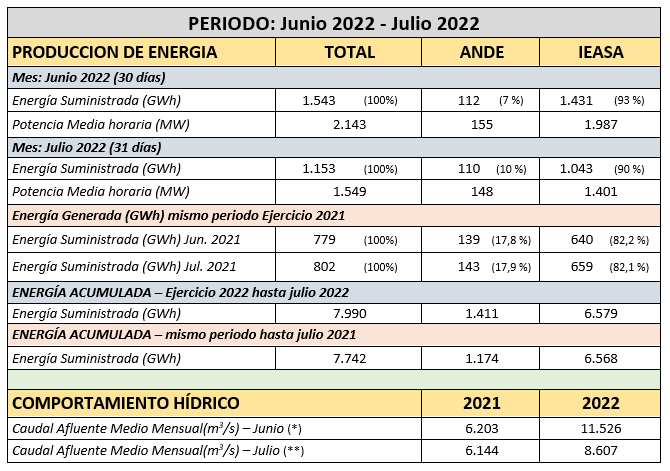 El informe oficial del Departamento Técnico de la Central Hidroeléctrica Yacyretá sobre generación de energía correspondiente al mes de julio del 2022, señala que, el total suministrado al Sistema Interconectado Nacional Paraguayo (SINP) de Paraguay y al Sistema Argentino de Interconexión (SADI) de Argentina, en el cierre del mes fue de 1.152.750,3 MWh, 25,29 % inferior al mes de junio, que fue de 1.542.995,3 MWh. Correspondió a la Administración Nacional de Electricidad (ANDE) 110.104,4 MWh y a Integración Energética Argentina Sociedad Anónima (IEASA) 1.042.645,9 MWh.