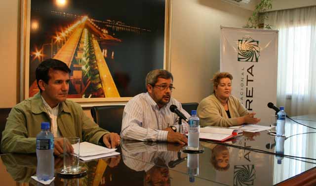Foto: (De Izq. a Der.) Walter Rojas, asesor del Área Social, Lic. Pablino Cáceres, coordinador del Área Social y Violeta Insaurralde, responsable del Programa de Becas, durante la conferencia de prensa realizada este lunes.