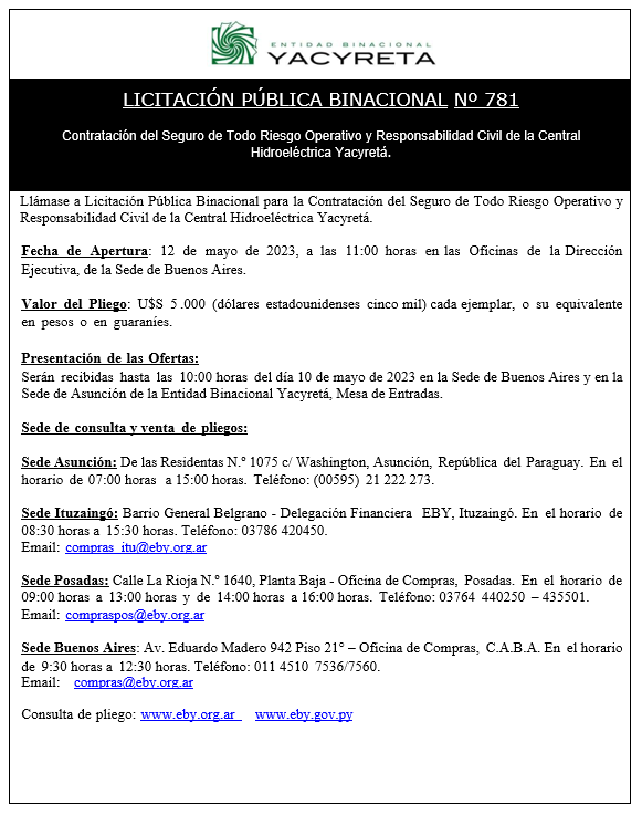 Licitación Pública Binacional N° 781 – Seguro de todo riesgo para la CHY