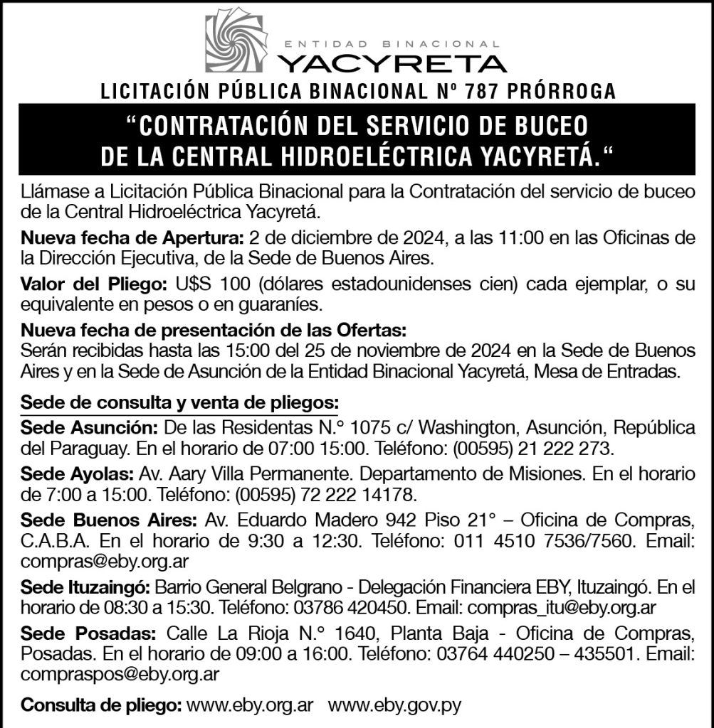 Licitación Pública Binacional N° 787 – Contratación del servicio de buceo de la Central Hidroeléctrica Yacyretá (Prórroga)